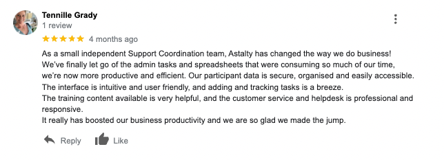 Astalty is more than just software; it stands as a purposely crafted CRM to aid providers in aligning with NDIS standards. With over 500 businesses utilising our platform and over 120 five-star reviews on Google, Astalty has proven itself to be a reliable and effective tool in the realm of business operations.